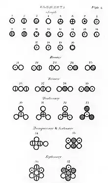 Dalton used his own symbols to visually represent the atomic structure of compounds. They were depicted in the New System of Chemical Philosophy, where he listed 21 elements and 17 simple molecules.