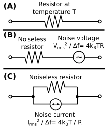 where Δf is the bandwidth in hertz over which the noise is measured. For a 1 kΩ resistor at room temperature and a 10 kHz bandwidth, the RMS noise voltage is 400 nV.[8] A useful rule of thumb to remember is that 50 Ω at 1 Hz bandwidth correspond to 1 nV noise at room temperature.