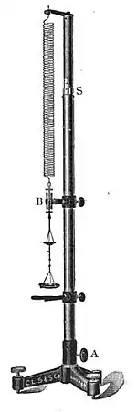 The Jolly balance is an instrument for determining specific gravities. Invented by the German physicist Philipp von Jolly in 1864,[1] it consists of a spring fastened at the top to a movable arm. At the lower end, the spring is provided with two small pans, one suspended beneath the other. The lower pan is kept immersed to the same depth in water, while the other one hangs in the air. On the upright stand behind the spring is a mirror on which is engraved or painted a scale of equal parts. The specific gravity of an object, typically a solid, is determined by noting how much the spring lengthens when the object is resting in the upper pan in air (), and then when the object is moved to the lower pan and immersed in water (). The specific gravity is .[2]
