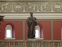 Bronze statues of Henry and Isaac Newton represent science on the balustrade of the galleries of the Main Reading Room in the Thomas Jefferson Building of the Library of Congress on Capitol Hill in Washington, D.C. They are two of the 16 historical figures depicted in the reading room, each pair representing one of the 8 pillars of civilization.