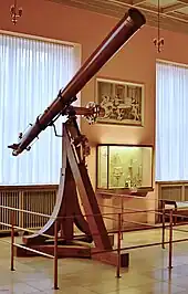 Fraunhofer produced various optical instruments for his firm.[8] This included the Fraunhofer Dorpat Refractor used by Struve (delivered 1824 to Dorpat Observatory), and the Bessel Heliometer (delivered posthumously), which were both used to collect data for stellar parallax. The firm's successor, Merz und Mahler, made a telescope for the New Berlin Observatory, which confirmed the existence of the major planet Neptune. Possibly the last telescope objective made by Fraunhofer was supplied for a transit telescope at the City Observatory, Edinburgh,[18] the telescope itself being completed by Repsold of Hamburg after Fraunhofer's death.