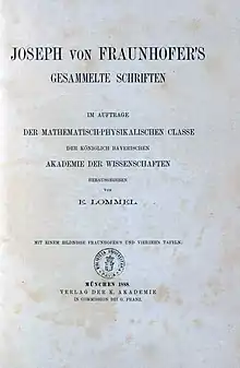 - Reprinted, with additional findings and notes, in: Joseph Fraunhofer (1817) "Bestimmung des Brechungs- und des Farben-Zerstreuungs – Vermögens verschiedener Glasarten, in Bezug auf die Vervollkommnung achromatischer Fernröhre" Archived 10 October 2016 at the Wayback Machine (Determination of the refractive and color-dispersing power of different types of glass, in relation to the improvement of achromatic telescopes), Annalen der Physik, 56: 264–313; see especially pages 278–286.