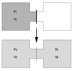 The process begins with gas under some pressure, , at temperature , confined to one half of a thermally isolated container (see the top part of the drawing at the beginning of this article). The gas occupies an initial volume , mechanically separated from the other part of the container, which has a volume , and is under near zero pressure. The tap (solid line) between the two halves of the container is then suddenly opened, and the gas expands to fill the entire container, which has a total volume of (see the bottom part of the drawing). A thermometer inserted into the compartment on the left (not shown in the drawing) measures the temperature of the gas before and after the expansion.