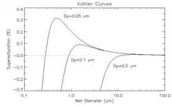 The figure above shows three Köhler curves of sodium chloride. Consider (for droplets containing solute with diameter equal to 0.05 micrometers) a point on the graph where the wet diameter is 0.1 micrometers and the supersaturation is 0.35%. Since the relative humidity is above 100%, the droplet will grow until it is in thermodynamic equilibrium. As the droplet grows, it never encounters equilibrium, and thus grows without bound. However, if the supersaturation is only 0.3%, the drop will only grow until about 0.5 micrometers. The supersaturation at which the drop will grow without bound is called the critical supersaturation. The diameter at which the curve peaks is called the critical diameter.