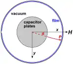 Therefore, Alfred Bucherer (1908) conducted a precise measurement using a velocity filter similar to Bestelmeyer's. See Figs. 4 & 5. A radium beta source was placed at the center of a circular condenser consisting of two silvered glass plates spaced 0.25 mm apart and charged to about 500 volts, set in a homogeneous 140 Gauss magnetic field. The radium emitted beta rays in all directions, but in any particular direction α, only those beta rays exited the velocity filter whose speed was such that the electric and magnetic fields exactly compensated each other. After leaving the condenser, the rays were deflected by the magnetic field, and exposed a photographic plate set parallel to the condenser rim and perpendicular to the non-deflected rays.[22][23]