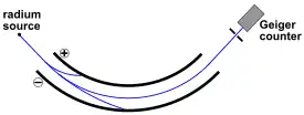 Walter Kaufmann began to experiment with beta rays using a device similar to a cathode ray tube, where the source of the electrons was the decay of radium that was placed in an evacuated container. (See Fig. 1) Such rays emitted from radium were called "Becquerel rays" at that time. Contrary to the then known cathode rays which reached speeds only up to 0.3c, c being the speed of light, Becquerel rays reached velocities up to 0.9c. However, since beta particles have different velocities, the radiation was inhomogeneous. Therefore, Kaufmann applied electric and magnetic fields aligned parallel to each other, so that the deflections caused by them were perpendicular to each other. Their impacts on a photographic plate produced a deflection curve, whose individual points corresponded to a certain velocity and a certain mass of the electrons. By reversing the charge on the condenser, thus inverting the electric field, two symmetric curves could be obtained, whose center line determined the direction of the magnetic deflection.[A 4][A 5]