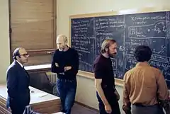 Discussion in the main lecture hall at the École de Physique des Houches (Les Houches Physics School), 1972. From left, Yuval Ne'eman, Bryce DeWitt, Thorne, Demetrios Christodoulou.