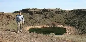 Kolks are credited with creating the pothole-like features in the highly jointed basalts in the channeled scablands of the Columbia Basin region in Eastern Washington. Depressions were scoured out within the scablands that resemble virtually circular steep-sided potholes.[2] Examples from the Missoula floods in this area include:[1]