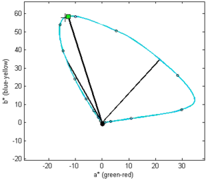 The color of pumpkin oil at increasing thickness or concentration presented in CIELAB colorspace diagram. Straight lines are vectors showing hue (angle) and chroma (length) of the color at maximal chroma (toward the square mark), and the colors of four-fold less or more diluted or thick pumpkin oil (DIL and DID). Note that DID is −44.1 degrees and DIL corresponds to −8.97 degrees.