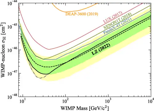In July 2022, the LZ collaboration published in a preprint its first upper limit on the spin-independent WIMP-nucleon scattering cross section, using approximately 60 livedays worth of data.[9][10] Future searches intend to further probe for WIMP scatters, with a nominal search period of 1000 days.
