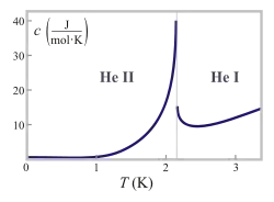 The point's name derives from the graph (pictured) that results from plotting the specific heat capacity as a function of temperature (for a given pressure in the above range, in the example shown, at 1 atmosphere), which resembles the Greek letter lambda . The specific heat capacity has a sharp peak as the temperature approaches the lambda point. The tip of the peak is so sharp that a critical exponent characterizing the divergence of the heat capacity can be measured precisely only in zero gravity, to provide a uniform density over a substantial volume of fluid. Hence the heat capacity was measured within 2 nK below the transition in an experiment included in a Space Shuttle payload in 1992.[3]