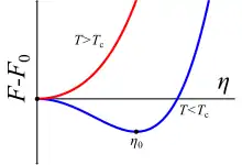 Consider a system that breaks some symmetry below a phase transition, which is characterized by an order parameter . This order parameter is a measure of the order before and after a phase transition; the order parameter is often zero above some critical temperature and non-zero below the critical temperature. In a simple ferromagnetic system like the Ising model, the order parameter is characterized by the net magnetization , which becomes spontaneously non-zero below a critical temperature . In Landau theory, one considers a free energy functional that is an analytic function of the order parameter. In many systems with certain symmetries, the free energy will only be a function of even powers of the order parameter, for which it can be expressed as the series expansion[3]
