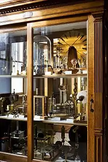 The large electrostatic generator (Dutch: Van Marum electriseermachine) is a large handcrafted electromechanical instrument designed by Martin van Marum and built by John Cuthbertson in 1784 for the Teylers Museum in Haarlem, where it forms the centerpiece of the instrument room. The concept of an electrostatic generator was new, and the battery (array) of leiden jars was the largest ever built (only one of the 4 sets of leiden jars is on display to conserve space). The two glass disks of the triboelectric generator (friction generator) are 1.65 meters in diameter, and the machine is capable of generating a potential of 330,000 volts.[1]
