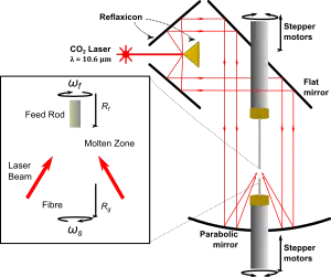 An improvement to the laser-heated crystal growth technique was made by Fejer et al.,[13] who incorporated a special optical component known as a reflaxicon, consisting of an inner cone surrounded by a larger coaxial cone section, both with reflecting surfaces. This optical element converts the cylindrical laser beam into a larger diameter hollow cylinder surface.[14] This optical component allows radial distribution of the laser energy over the molten zone, reducing radial thermal gradients. The axial temperature gradient in this technique can go as high as 10000 °C/cm, which is very high when compared to traditional crystal growth techniques (10–100 °C/cm).