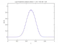 The Lax–Friedrichs method, named after Peter Lax and Kurt O. Friedrichs, is a numerical method for the solution of hyperbolic partial differential equations based on finite differences. The method can be described as the FTCS (forward in time, centered in space) scheme with a numerical dissipation term of 1/2. One can view the Lax–Friedrichs method as an alternative to Godunov's scheme, where one avoids solving a Riemann problem at each cell interface, at the expense of adding artificial viscosity.