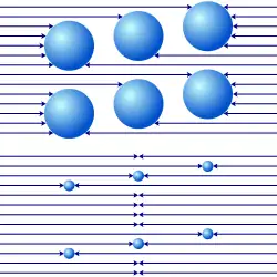 Fatio assumed that the universe is filled with minute particles, which are moving indiscriminately with very high speed and rectilinearly in all directions. To illustrate his thoughts he used the following example: Suppose an object C, on which an infinite small plane zz and a sphere centered about zz is drawn. Into this sphere Fatio placed the pyramid PzzQ, in which some particles are streaming in the direction of zz and also some particles, which were already reflected by C and therefore depart from zz. Fatio proposed that the mean velocity of the reflected particles is lower and therefore their momentum is weaker than that of the incident particles. The result is one stream, which pushes all bodies in the direction of zz. So on one hand the speed of the stream remains constant, but on the other hand at larger proximity to zz the density of the stream increases and therefore its intensity is proportional to 1/r2. And because one can draw an infinite number of such pyramids around C, the proportionality applies to the entire range around C.