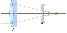 A Barlow lens (B) reimages a virtual object (focus of red ray path) into a magnified real image (green rays at focus)