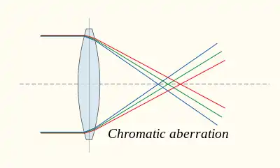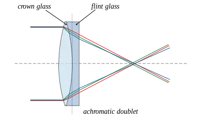 Chromatic aberration is caused by the dispersion of the lens material—the variation of its refractive index, n, with the wavelength of light. Since, from the formulae above, f is dependent upon n, it follows that light of different wavelengths is focused to different positions. Chromatic aberration of a lens is seen as fringes of colour around the image. It can be minimised by using an achromatic doublet (or achromat) in which two materials with differing dispersion are bonded together to form a single lens. This reduces the amount of chromatic aberration over a certain range of wavelengths, though it does not produce perfect correction. The use of achromats was an important step in the development of the optical microscope. An apochromat is a lens or lens system with even better chromatic aberration correction, combined with improved spherical aberration correction. Apochromats are much more expensive than achromats.