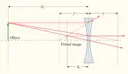 Using a positive lens of focal length f, a virtual image results when S1 < f, the lens thus being used as a magnifying glass (rather than if S1f as for a camera). Using a negative lens (f < 0) with a real object (S1 > 0) can only produce a virtual image (S2 < 0), according to the above formula. It is also possible for the object distance S1 to be negative, in which case the lens sees a so-called virtual object. This happens when the lens is inserted into a converging beam (being focused by a previous lens) before the location of its real image. In that case even a negative lens can project a real image, as is done by a Barlow lens.
