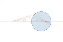 In the extreme case where an object is an infinite distance away, S1 = ∞, S2 = f and M = −f/∞ = 0, indicating that the object would be imaged to a single point in the focal plane. In fact, the diameter of the projected spot is not actually zero, since diffraction places a lower limit on the size of the point spread function. This is called the diffraction limit.