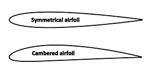 The maximum lift force that can be generated by an airfoil at a given airspeed depends on the shape of the airfoil, especially the amount of camber (curvature such that the upper surface is more convex than the lower surface, as illustrated at right). Increasing the camber generally increases the maximum lift at a given airspeed.[67][68]