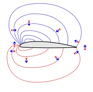 The pressure is also affected over a wide area, in a pattern of non-uniform pressure called a pressure field. When an airfoil produces lift, there is a diffuse region of low pressure above the airfoil, and usually a diffuse region of high pressure below, as illustrated by the isobars (curves of constant pressure) in the drawing. The pressure difference that acts on the surface is just part of this pressure field.[87]
