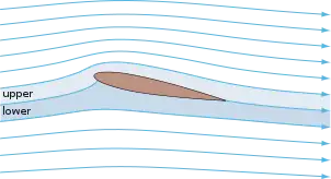 An airfoil generates lift by exerting a downward force on the air as it flows past. According to Newton's third law, the air must exert an equal and opposite (upward) force on the airfoil, which is lift.[16][17][18][19]