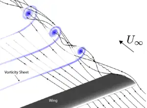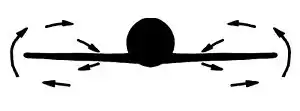 More broadly, some consider the effect to include the tendency of any fluid boundary layer to adhere to a curved surface, not just the boundary layer accompanying a fluid jet. It is in this broader sense that the Coandă effect is used by some popular references to explain why airflow remains attached to the top side of an airfoil.[33][34] This is a controversial use of the term "Coandă effect"; the flow following the upper surface simply reflects an absence of boundary-layer separation, thus it is not an example of the Coandă effect.[35][36][37][38] Regardless of whether this broader definition of the "Coandă effect" is applicable, calling it the "Coandă effect" does not provide an explanation, it just gives the phenomenon a name.[39]
