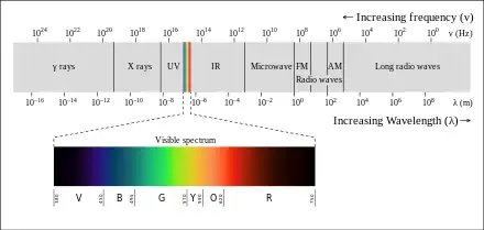 Light, visible light, or visible radiation is electromagnetic radiation that can be perceived by the human eye.[1] Visible light spans the visible spectrum and is usually defined as having wavelengths in the range of 400–700 nanometres (nm), corresponding to frequencies of 750–420 terahertz. The visible band sits adjacent to the infrared (with longer wavelengths and lower frequencies) and the ultraviolet (with shorter wavelengths and higher frequencies), called collectively optical radiation.[2][3]