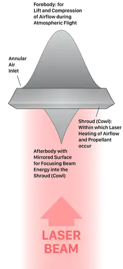 A ground-based laser aims a high power pulse to the mirror stern. The beam is reflected and focuses to heat the air at an extremely high temperature up to 30,000 degrees, transforming it in a plasma that violently expands, pushing the craft forward. Air is renewed through the inlet and the cycle is repeated at high frequency, acting as an external pulse detonation engine producing thrust.[7]
