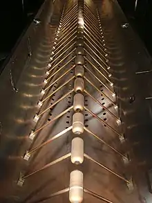 As linear accelerators were developed with higher beam currents, using magnetic fields to focus proton and heavy ion beams presented difficulties for the initial stages of the accelerator. Because the magnetic force is dependent on the particle velocity, it was desirable to create a type of accelerator which could simultaneously accelerate and focus low-to-mid energy hadrons.[11] In 1970, Soviet physicists I. M. Kapchinsky and Vladimir Teplyakov proposed the radio-frequency quadrupole (RFQ) type of accelerating structure. RFQs use vanes or rods with precisely designed shapes in a resonant cavity to produce complex electric fields. These fields provide simultaneous acceleration and focusing to injected particle beams.[12]