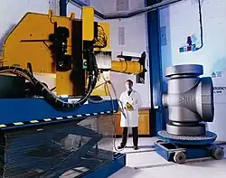 Steel casting undergoing x-ray using the linear accelerator at Goodwin Steel Castings Ltd