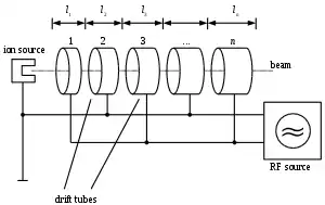 Wideroe's linac concept. The voltage from an RF source is connected to a series of tubes which shield the particle between gaps.