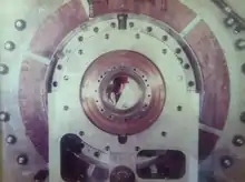 In the Linus concept, the reactor chamber consists of a drum filled with a liquid metal liner, typically molten lead-lithium. The drum is spun, creating centrifugal force which causes the liquid to be forced onto the inside wall of the container. There is only enough liquid metal to fill perhaps 20% of the total volume, so a large open area in the middle forms during rotation.[5] For operation, a system, typically consisting of pistons, is used to drive additional liquid metal into the drum. This causes the entire liner to be forced inward. In experimental systems, this provided about ten-to-one compression. The extra metal is then removed again by releasing the pistons, causing the compression to reverse and the metal reach the original position at the outside of the drum.[5]