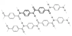 Liquid crystallinity in polymers may occur either by dissolving a polymer in a solvent (lyotropic liquid-crystal polymers) or by heating a polymer above its glass or melting transition point (thermotropic liquid-crystal polymers).[6] Liquid-crystal polymers are present in melted/liquid or solid form.[7] In solid form, the main example of lyotropic LCPs is the commercial aramid known as Kevlar. The chemical structure of this aramid consists of linearly substituted aromatic rings linked by amide groups. In a similar way, several series of thermotropic LCPs have been commercially produced by several companies.