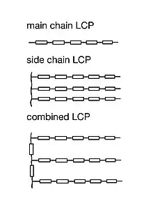 LCPs are categorized by the location of liquid crystal cores. Due to the creation and research of different classes of LCPs, different prefixes are used to help the classification of LCPs.[10] Main chain liquid crystal polymers (MCLCPs) have liquid crystal cores in the main chain. By contrast, side chain liquid crystal polymers (SCLCPs) have pendant side chains containing the liquid crystal cores.[10]