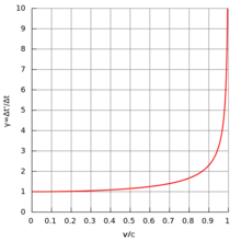 Lorentz factor γ as a function of fraction of given velocity and speed of light. Its initial value is 1 (when v = 0); and as velocity approaches the speed of light (vc) γ increases without bound (γ → ∞).