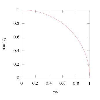 α (Lorentz factor inverse) as a function of velocity—a circular arc