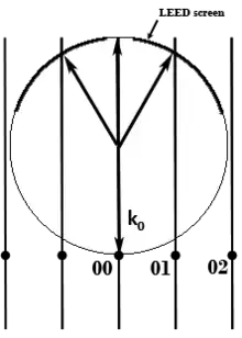 Ewald's sphere construction for the case of normal incidence of the primary electron beam. Here, this is done in a typical LEED set-up, however, in LEEM, there are complicated electron optics that allow for imaging of the resultant diffraction patterns and hence, the surface of the sample.