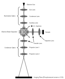 Magnetic beam separator is needed to resolve the illuminating and imaging beam (while in turn spatially separating the optics for each). There has been much development on the technology of electron beam separators; the early separators introduced distortion in either the image or diffraction plane. However, IBM recently developed a hybrid prism array/nested quadratic field design, focusing the electron beams both in and out of the plane of the beampath, allowing for deflection and transfer of the image and diffraction planes without distortion or energy dispersion.