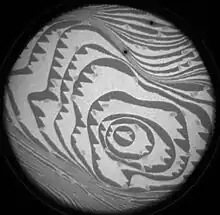 The LEEM image corresponding to a sub-monolayer palladium film (dark contrast) grown on the (110) surface of a tungsten crystal (bright contrast). The barely visible islands are tungsten carbides due to carbon contamination. Diameter of the imaged area is 10 micrometres.