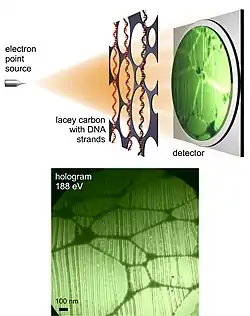 Low-energy electron holography of DNA molecules stretched over lacey carbon. Adapted from Latychevskaia et al.[7]