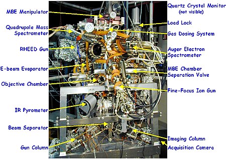 Low-energy electron microscopy, or LEEM, is an analytical surface science technique used to image atomically clean surfaces, atom-surface interactions, and thin (crystalline) films.[1] In LEEM, high-energy electrons (15-20 keV) are emitted from an electron gun, focused using a set of condenser optics, and sent through a magnetic beam deflector (usually 60˚ or 90˚). The “fast” electrons travel through an objective lens and begin decelerating to low energies (1-100 eV) near the sample surface because the sample is held at a potential near that of the gun. The low-energy electrons are now termed “surface-sensitive” and the near-surface sampling depth can be varied by tuning the energy of the incident electrons (difference between the sample and gun potentials minus the work functions of the sample and system). The low-energy elastically backscattered electrons travel back through the objective lens, reaccelerate to the gun voltage (because the objective lens is grounded), and pass through the beam separator again. However, now the electrons travel away from the condenser optics and into the projector lenses. Imaging of the back focal plane of the objective lens into the object plane of the projector lens (using an intermediate lens) produces a diffraction pattern (low-energy electron diffraction, LEED) at the imaging plane and recorded in a number of different ways. The intensity distribution of the diffraction pattern will depend on the periodicity at the sample surface and is a direct result of the wave nature of the electrons. One can produce individual images of the diffraction pattern spot intensities by turning off the intermediate lens and inserting a contrast aperture in the back focal plane of the objective lens (or, in state-of-the-art instruments, in the center of the separator, as chosen by the excitation of the objective lens), thus allowing for real-time observations of dynamic processes at surfaces. Such phenomena include (but are not limited to): tomography, phase transitions, adsorption, reaction, segregation, thin film growth, etching, strain relief, sublimation, and magnetic microstructure. These investigations are only possible because of the accessibility of the sample; allowing for a wide variety of in situ studies over a wide temperature range. LEEM was invented by Ernst Bauer in 1962; however, not fully developed (by Ernst Bauer and Wolfgang Telieps) until 1985.
