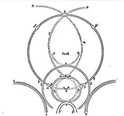 Original (in French): 6. Ces deux derniers parhélies qui se trouvoient à quelque distance des intersections du grand cercle horizontal par les deux couronnes qui entourent le soleil, renvoyoient d'abord des deux cotés de parties d'arc très courtes colorées xi & yk dont la direction s'inclinoit au dessous du soleil jusqu'aux deux demi-arcs de cercle intérieurs die & dke. En second lieu ils étoient pourvues des queues longues, claires & blanches x ζ & y η , opposées au soleil & renfermées dans la circonference du grand cercle afbg.[4]