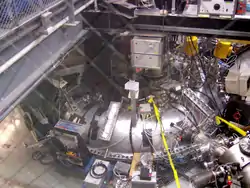 As the beam passes through the plasma, the atoms are ionized as they bounce off the ions in the plasma. Because the magnetic field inside the torus is bent into a circle, the fast ions are hoped to be confined in the background plasma. The confined fast ions are slowed down by the background plasma, the same way air resistance slows down a baseball. The energy transfer from the fast ions to the plasma increases the plasma temperature. The actual injector can be seen from the observation window. It looks like a long silver cylinder laying on its side but tilted slightly downward against the torus near the back of the machine. When the injector is pulsed, 20,000 volts accelerates the beam to about 30 amperes of current for about 1.5 milliseconds.