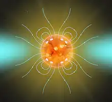 Ionized material captured by the magnetic field lines will rotate with the Sun as if it were a solid body. As material escapes from the Sun due to the solar wind, the highly ionized material will be captured by the field lines and rotate with the same angular velocity as the Sun, even though it is carried far away from the Sun's surface, until it eventually escapes. This effect of carrying mass far from the centre of the Sun and throwing it away slows down the spin of the Sun.[1][2] The same effect is used in slowing the spin of a rotating satellite; here two wires spool out weights to a distance slowing the satellites spin, then the wires are cut, letting the weights escape into space and permanently robbing the spacecraft of its angular momentum.
