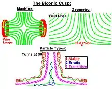 If one of the poles in the magnetic bottle is reversed, it becomes a biconic cusp, which can also hold charged particles.[40][41][42] Biconic cusps were first studied by Harold Grad at the Courant Institute, studies reveal the presence of different types of particles inside a biconic cusp. The most financed cusp approach is the Compact Fusion Reactor which was supported by Lockheed-Martin starting in 2007.[43]
