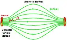 In a classic magnetic mirror, a configuration of electromagnets is used to create an area with an increasing density of magnetic field lines at either end of a confinement volume. Particles approaching the ends experience an increasing force that eventually causes them to reverse direction and return to the confinement area.[1] This mirror effect will occur only for particles within a limited range of velocities and angles of approach, while those outside the limits will escape, making mirrors inherently "leaky".