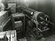 The 1978 2X magnetic bottle experiment. Fred Coensgen is pictured. The cylinder holds one set of neutral beam injectors, the mirror itself is not visible.