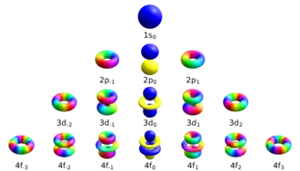 The four quantum numbers conventionally used to describe the quantum state of an electron in an atom are the principal quantum number n, the azimuthal (orbital) quantum number , and the magnetic quantum numbers ml and ms. Electrons in a given subshell of an atom (such as s, p, d, or f) are defined by values of (0, 1, 2, or 3). The orbital magnetic quantum number takes integer values in the range from to , including zero.[3] Thus the s, p, d, and f subshells contain 1, 3, 5, and 7 orbitals each, with values of ml within the ranges 0, ±1, ±2, ±3 respectively. Each of these orbitals can accommodate up to two electrons (with opposite spins), forming the basis of the periodic table.